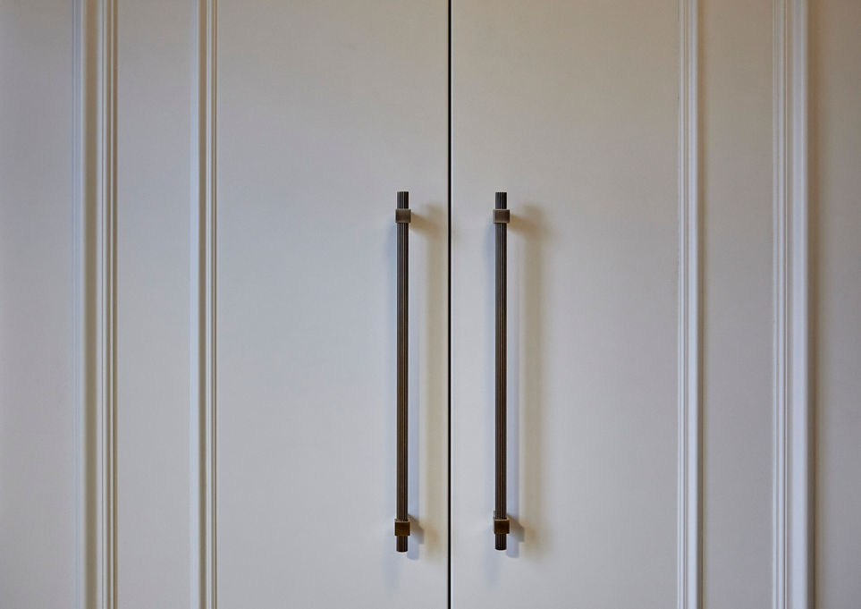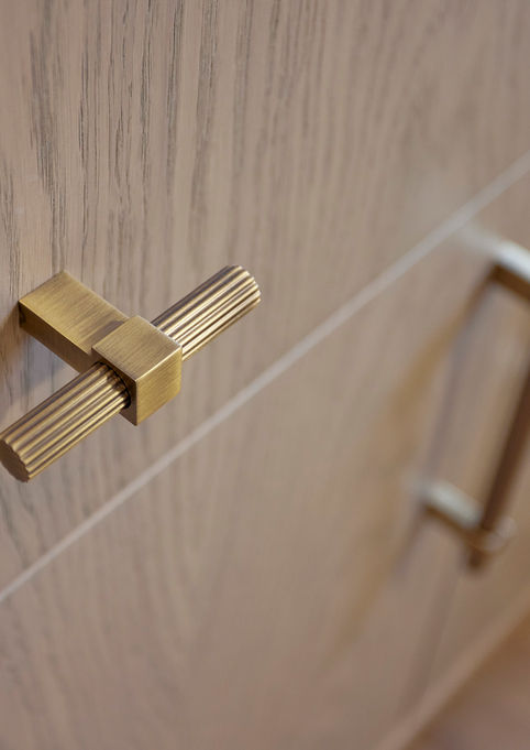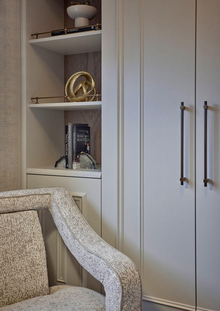 Bespoke joinery now defines the room, mixing open shelving with oak accents and antique brass details alongside elegant moulded cabinetry. A custom-designed sideboard provides dedicated storage for the client’s gift wrapping, blending beauty with purpose. Finished with soft wallpaper, a bespoke roman blind, and curated accessories, the space feels timeless, inviting, and effortlessly refined.